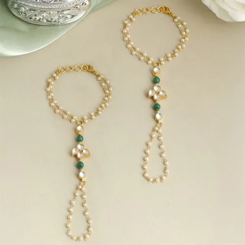 Celebrate elegance with this ornate hand adornment, a stunning piece that embodies the essence of natures beauty. The seamless integration of pearl strands creates a fluid connection between the wrist and fingers, transforming your hand into a luxurious art piece.