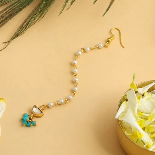 This gift set contains: • Pearl and Green Bead Maang Tikka