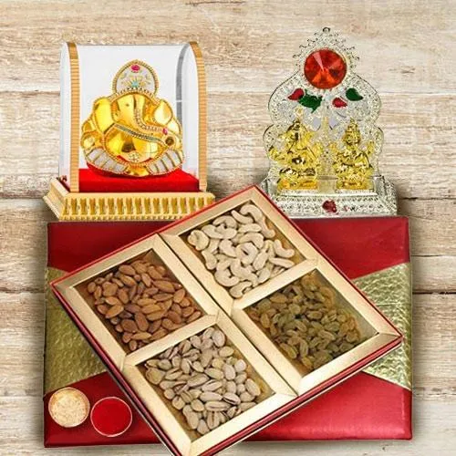 Deliver moments to cherish as you send this Bhai Dooj Gift Combo of Crunchy Mixed Dry Fruits with Vighnesh Ganesh N Mandap to your Brother and make the celebrations a moment to cherish for life time. This gift comes with finest Dry Fruits like Almond, Cashew and Raisins (200 g each), decorated Vighnesh Ganesh Idol in a transparent case and ethnic Ganesh Laxmi Mandap.