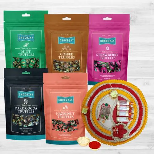 Make your brother happy by sending him a gift of Delicious Five Assorted Truffle Chocolates with Pooja Thali for Bhai Dooj. This combo has Mint Truffle, Coffee Truffles, Strawberry Truffle, Dark Cocoa Truffle n Hazelnut Truffle Chocolates from Chocozay (225 gms each) with Designer Pooja Thali n Free Roli Tika