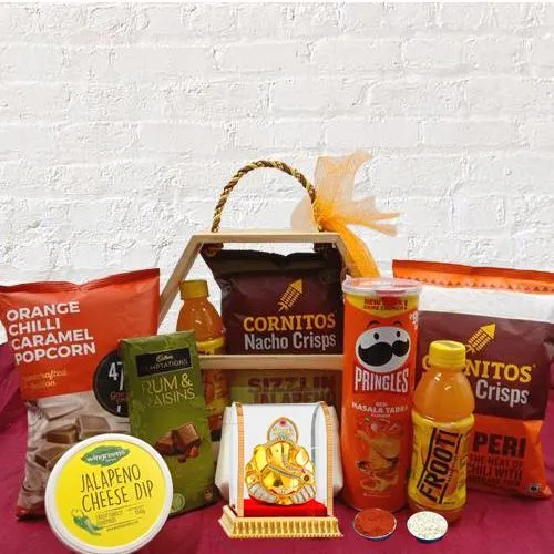 Pamper your loving brother on Bahi Dooj by sending them this Amazing Matinee Time Bhai Dooj Gift Basket with Free Roli Tika exclusively meant to convey your wishes in the best manner. This gift hamper has - 1) Pringle Chips (100g) 2) Cornitos Jalapeno Nachos Crisp (60g) 3) Cornitos Peri Peri Nachos Crisp (60g) 4) 4700BC Himalayan Salt Caramel Popcorn (44g) 5) Wingreens Cheese Dip 6) Cadbury Temptation Chocolate Bar (72g, Rum n Raisins) 7) Parle Fruity (2 bottles) 8) Vighnesh Idol 9) Reusable Wooden Hexagonal Basket 10) Free Roli Teeka N Chawal.