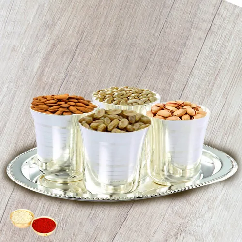 Crunchy mixed Dry Fruits with Silver Glasses and Tray with free Roli Tilak and Chawal