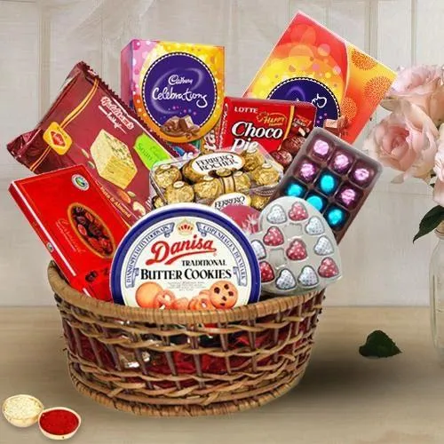 Deliver moments to cherish as you send this Bhai Dooj Gift Combo of Exquisite Goodies Gift Hamper to your Brother to make the celebrations a moment to cherish for life time. This Hamper arrives with- 1) 11 pc Red Heart Assorted Homemade Chocolates 2) 18 pc Homemade Assorted Chocolates 3) 16 Pc Ferrero Rocher Chocolates 4) Small Cadbury Celebration Pack (64.2 gm) 5) Cadbury Celebration Assortment Pack (126 gm) 6) Danish Butter Cookies (400 gm) 7) Soan Papdi (200 gm) 8) Lotte Chocopie (168 gm) 9) Free Roli, Tika and Chawal 10) 1 Basket