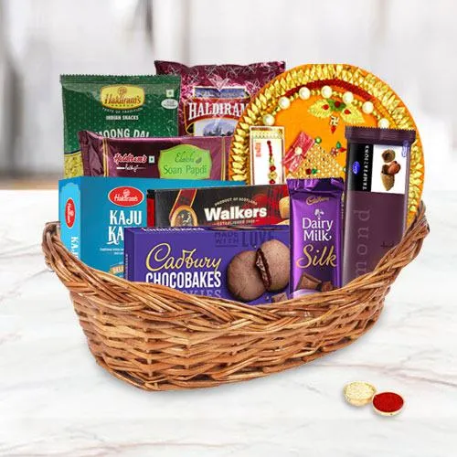 See the glow on your family members face when you will deliver this Celebration Gifts Basket for Family and let him have a huge smile on this occasion. This Hamper includes- 1. Cadbury Chocobakes (75 gm), 2. Imported Walkars Short Butter Bread, 3. Haldirams Masala Mixture (200 gms), 4. Haldirams Moong Dal (200 gms), 5. Haldirams Kaju Katli (250 gm), 6. Haldirams Soan Papdi (200 gms), 7. Cadbury Dairy Milk Silk (75 gm), 8. Cadbury Temptation (75 gm), 9. Designer Pooja Thali 10. Cane Basket 11. with Free Bhai Dooj Tika N Chawal.