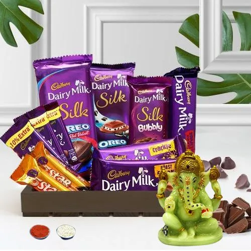 Dreamy Cadbury Delight Gift Basket with Glowing Ganesha N Roil Chawal