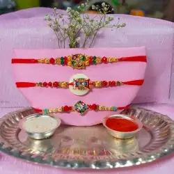 This is a gift of : • A Bhaiya Bhabi Rakhi Set (BBS9523) • Complimentary Roli Tika N Chawal • Complimentary Message Card