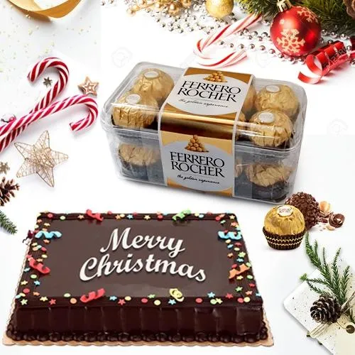 Create wonders in the life of the people you love by sending this X-Mas Special Chocolate Cake (1 lb) with 16 pc Ferrero Rocher Chocolates and make them your fan.