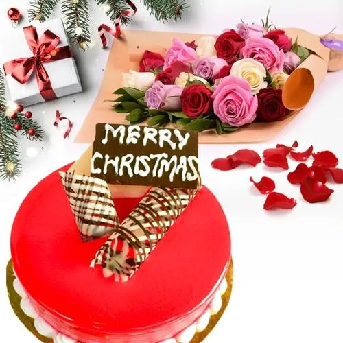 Bring smiles on the faces of your dear ones with this gift of Glorious Strawberry Cake with Roses Bunch for X Mas and make your bond stronger. This creamy 2.2 lb Strawberry Cake comes with a bouquet of 15 Assorted Roses.