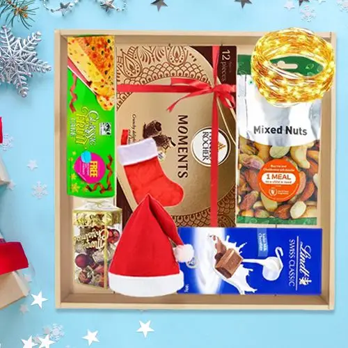 Send this surprise of Tempting X-Mas Special Chocolate Gift Tray to your dear ones and bring happiness in their lives. This gift hamper comprises of - 1. American Fruit Cake (400g) 2. Lindt Excellence (100g) 3. Mixed Nuts (250g) 4. 16 pcs Ferrero Rocher Moments 5. Christmas Decoration 6. Christmas Lights 7. Christmas Cap N Stockings 8. A Reusable Wooden Tray