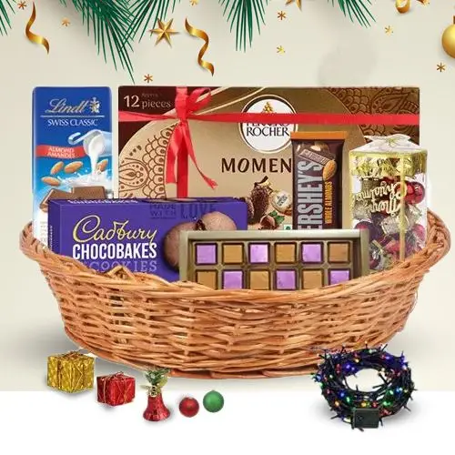 Make occasions grander with this Enjoyable Christmas Celebration Gift Bag and share the moment with your loved ones. This gift hamper comprises of - 1. Hersheys Almond Chocolate Bar (100g) 2. 12 pcs Handmade Chocolates 3. 16 pcs Ferrero Rocher Moments 4. Lindt Excellence Chocolate Bar (100g) 5. Cadbury Chocobakes ((126g) 6. Christmas Decoration 7. Christmas Lights 8. A Reusable Cane Basket