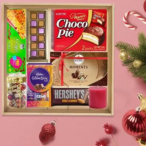 Delight your loved ones with this Exquisite X-Mas Cake with Chocolates N Assortment Gift Tray and make them realize how special they mean to you. This gift hamper comprises of - 1. American Fruit Cake (400g) 2. Lotte Chocopie (168g) 3. 12 pcs Handmade Chocolate 4. 16 pcs Ferrero Rocher Moments 5. Cadbury Celebration Mini (59.8g) 6. Hersheys Almond (100g) 7. Christmas Decoration 8. 1 pc Pillar Candle 9. A Reusable Wooden Tray