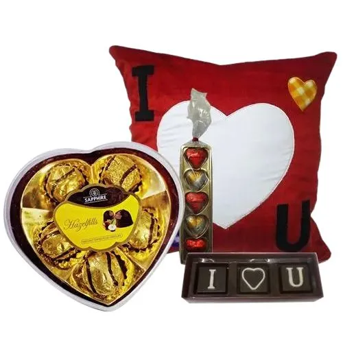 Amaze your girlfriend by gifting them this Attractive Personalized Hearty Delight Gift Combo and make her crave for more. This gift combo arrives with Personalised Square Velvet Cushion with a 5 pc Sapphire Chocolate Box, I Love You SMS Chocolate and 5 pc Heart Shape Handmade Chocolate.