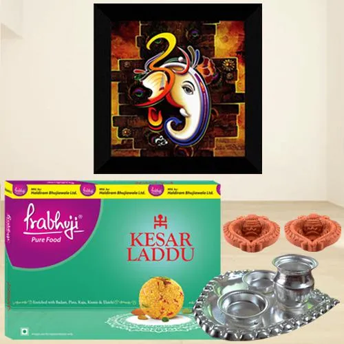 Send this exclusive gift of Traditional Pooja Thali with Lord Ganesha UV Frame Painting, Sweets n Diya to your dear one and express your love and affection. This Deepavali gift contains Ganesha UV Coated Home Decor Frame Painting, Haldiram Kesar Laddu (250 gm), Silver Plated Paan Shaped Puja Thali n 2 pcs Teracota Mud Diya.