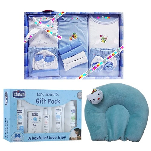 Impress your dear ones by sending this Remarkable Combo of Blue Dress with Chicco Gift Set N Neck Supporting Pillow and elegantly brighten up their mood instantly. This Combo comprises of: 1. a. Item: 13 pc Dress Set b. Age Group: Ideal for 1-3 Months c. Color: Blue d. Fabric: Cotton 2. a. Item: Chicco First Cuddle Gift Set b. Brand: Chicco c. Age Group: 1 Months and Up d. Item Dimensions: 17 x 6.4 x 17 cm 3. a. Item: Soft Neck Supporting Baby Pillow b. Color: Sea-Green c. Fill Material: Mustard Seeds d. Material: Velvet Note:- Country of Origin: India