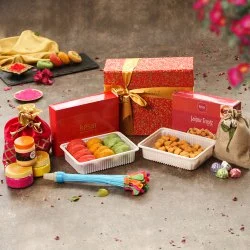 Gift your near and dear ones this Mesmerizing Haldirams Assorted Gift Hamper consisting of Haldirams Kesar Thandai 700 gms, 1/2 kg Haldirams Assorted Sweets, 200 gms Haldirams Bhujia and Free Herbal Gulal on this Holi and win their precious hearts.
