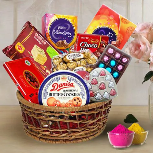 Make others feel special as you treat them with this Enticing Assortments Fusion for Holi in a very very special way. This item comes with: 1. 11 pc Red Heart Assorted Homemade Chocolates 2. 18 pc Homemade Assorted Chocolates 3. 16 Pc Ferrero Rocher Chocolates 4. Small Cadbury Celebration Pack 5. Cadbury Celebration Assortment Pack (126 gm) 6. Danish Butter Cookies 7. Soan Papdi 8. Chocopie 9. Free Multicolor Herbal Gulal 10. All items are arranged in a small Cane Basket