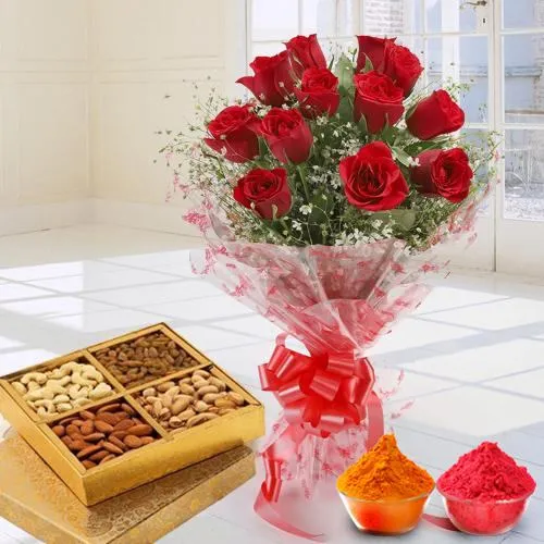 12 Red Roses Bouquet with Assorted Dry Fruits containing cashew nuts, almonds, apricots and raisins (500 gms (Gross Weight)) to your loved ones with Free Gulal