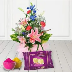 Deliver happiness on this festival of colors by gifting online this Delicious Chocolates Assortments Gift Basket for your relatives and friends. This charming Basket comes with 5 pcs Heart Shape Homemade Assorted Chocolates, 6 inch Teddy, 18 pcs Homemade Assorted Chocolates, 4 pcs Ferrero Rocher Chocolates, Cadbury Small Celebration, 2 Pcs Temptation and Cadbury Ecliars (Small Packet) with Free Gulal.