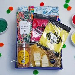 Deliver warm wishes on Holi festival by sending online this Fanciful Holi Greetings Gift Basket that will mesmerize the people whom you send this to. This amazing Gift Basket comes with Haldiram Soan Papdi (200 gms), Haldiram Bhujia, Assorted Dry Fruits, Cheese Straws Pack, Oreo Biscuits Pack, CCD Chips, Milk Bread, Jam, Cheese Slices, Tang Powder Pack, Knorr Soup and Chocopie with Free Gulal.