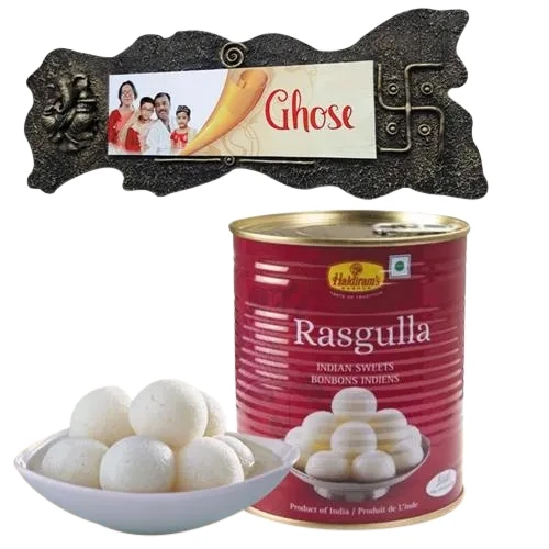 Convey your heartfelt wishes by gifting this Amazing Personalized Handmade Name Plate (18 x 8.5 cm) n Haldiram Rasgulla (1 kg) to the people dearest to you on the day of Housewarming .