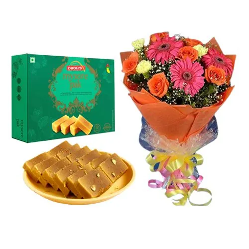 Ghee Mysorepak from Dadus with Seasonal Flower Bouquet