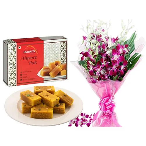 Ghee Mysorepak from Dadus with Orchid Bouquet