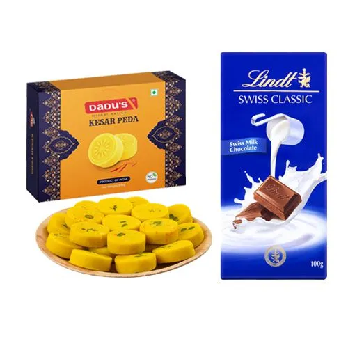 Buy Kesar Peda (500 gm) from Dadus with Lindt Excellence Chocolate Bar (100 gm, Milk) N deliver on the same day to make your dearest persons happy. (Only Available at Hyderabad)