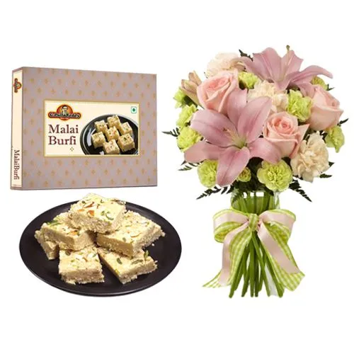 Shop Malai Burfi (250 gms) from G Pulla Reddy with a 8 Flowers Bouquet (Pink Lily, White Carnations N Pink Roses) to wish your loved ones on their special days.