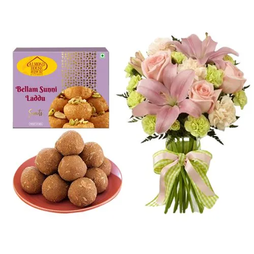Shop Bellam Sunni Laddu (500 gms) from Almond House with a 8 Flowers Bouquet (Pink Lily, White Carnations N Pink Roses) to wish your loved ones on their special days. (Only Available at Hyderabad)