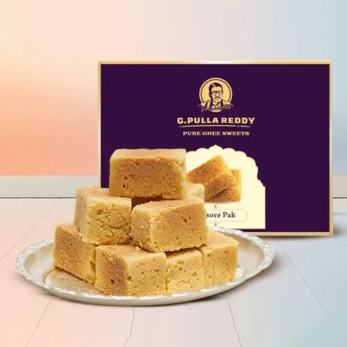 Indulge in the rich tradition of South Indian sweets with this gift of 500 grams of Mysore Pak. Renowned for its melt-in-the-mouth texture, Mysore Pak is a delicacy made from pure ghee, gram flour, and sugar, offering a blissful taste experience with every bite. This golden treat, with its crumbly yet soft consistency, is perfect for celebrating joyous occasions, sharing with loved ones, or simply savoring a moment of sweetness. Whether youre a connoisseur of traditional Indian sweets or looking to introduce someone to the flavors of South India, this Mysore Pak is a timeless gift that brings warmth and joy