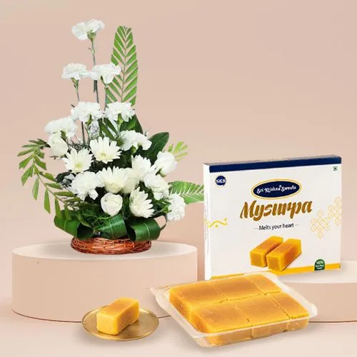 This gift combo includes: • 6 White Carnations N 6 White Gerberas Arrangement • Mysurpa (500 Gms)