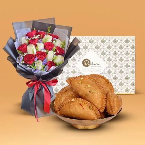 This elegant gift combo pairs a stunning arrangement of 25 red and white roses with 500 grams of Khova Gujia, creating a delightful blend of beauty and tradition. The roses, meticulously arranged in a harmonious display of passionate red and pure white, symbolize deep love, unity, and respect, making this arrangement perfect for anniversaries, weddings, or any occasion that celebrates meaningful connections. Complementing the floral beauty is Khova Gujia, a traditional Indian sweet known for its rich, creamy filling encased in a crispy pastry. Each bite of the Gujia offers a burst of sweet, comforting flavors that perfectly match the elegance of the roses. This combo is an ideal way to convey your heartfelt emotions with a touch of classic sweetness.