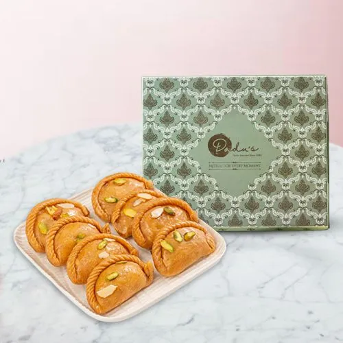 This is a gift of Khova Gujia, a delightful treat that captures the essence of traditional Indian sweets. Weighing 500 grams, these gujias are crafted with rich khoya, perfectly sweetened and encased in a crispy, golden pastry shell. Each bite offers a burst of flavor that is both indulgent and satisfying, making it a perfect gift for festive occasions or as a special treat for someone who appreciates the richness of authentic Indian desserts. Whether its for a celebration or a thoughtful gesture, Khova Gujia is a gift that brings warmth and sweetness to any moment.