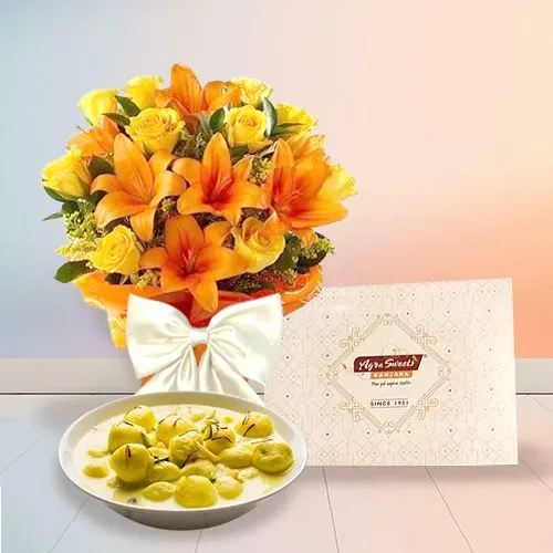 This gift combo includes: • 12 Yellow Roses N 9 Orange Lilies Bouquet • Rasmalai (10 Pcs)