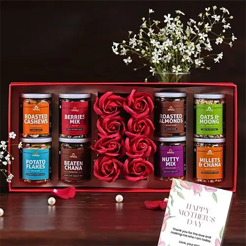 This Mothers Day Special gift box contains: • Berries Mix (80g) • Roasted Almonds (80g) • Roasted Cashews (75g) • Oats N Moong (75g) • Beaten Chana (60g) • Nutty Mix (50g) • Millets N Chana (30g) • Potato Flakes (20g) • Artificial Flowers (Set of 8) • Mothers Day Greeting Card - All Packed in a Gold Foiled Gift Box
