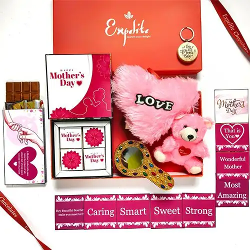 This Mothers day gift hamper contains: • 4 pcs Imported Chocolate Box (Mothers Day Theme Digital Print on Box and Chocolates) • I Love You Moon and Back Wooden Keyring • Heart Shape Pillow • Teddy • A Stone Engraved Hand Mirror • A Mothers Day Chocolate Bar (100g) • 7 Greeting Cards • All Packed in a Beautiful Red Box