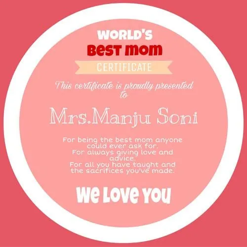 Delight your mother with this surprise gift of Adorable Best Mom Certificate and acknowledge her for caring for you on this Mothers Day. The Certificate will be in A4 size.