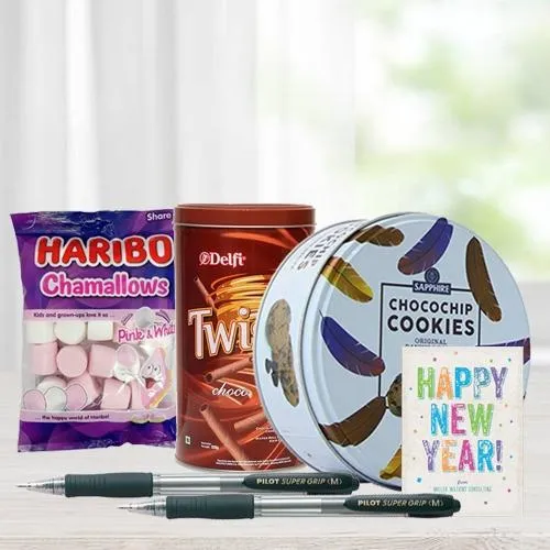 Delight your loved ones with this Delicious Cookies, Wafers N Marshmellos Combo for XMas and make them realize how special they mean to you. This Combo features- 1. Sapphire Butter Cookies Tin (400 g) 2. Delfi Twisters Rolled Wafers Tin Pack (320 g) 3. Marshmelts Marshmellos (140 g) 4. 2pcs Ball Point Pen 5. New Year Card