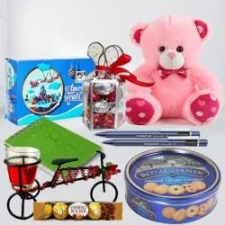 Surprise your loved ones with this Entertaining Arrangement of New Year Gift Items on this New Year and stay forever in their hearts. This Arrangement carries 2pcs Ball Point Pen, a 6 inch Teddy with Pocket Dairy and a Pack of Cadbury Celebration.