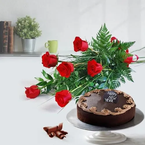 Buy this 1 Lb Chocolate Cake with 6 Red Roses Bouquet Gift combo for the ones you care for and make them feel extra happy and joyous.