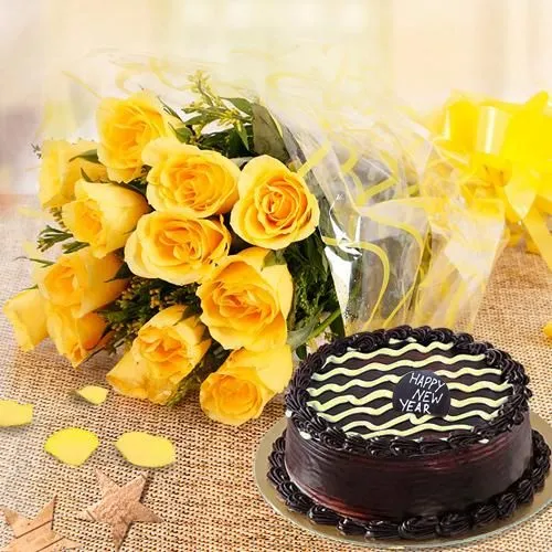 Buy this 1 Lb Chocolate Cake with 12 Yellow Rose Bouquet which is decorated with a tissue to present your loved ones with this token of your utmost affection and care for them.