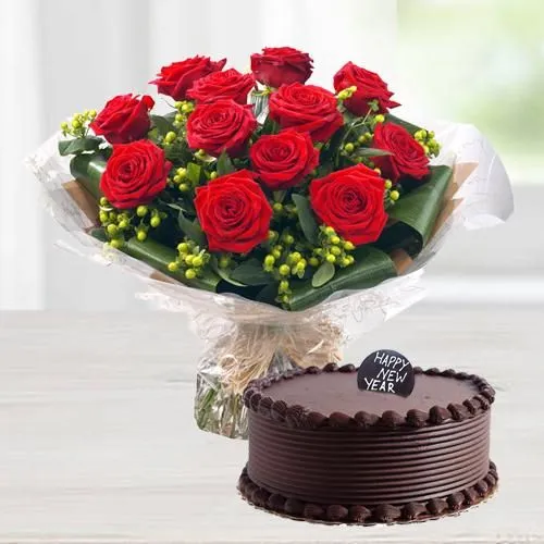 12 Red Roses Bunch with Chocolate Cake 2 Lbs - This combination of 12 Red Roses with the soft mouth watering chocolate cake is sure to make the day memorable for the recipient. Note: We deliver only Freshly Baked Cakes. Bakeries make ready the fresh baked Cake only by 11 AM. Thus all orders of Cake can only be delivered after noon time.