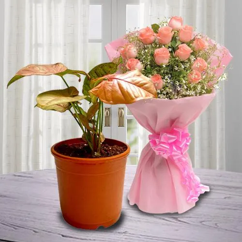 Paint a smile on the faces of the closest people in your life by sending this Evergreen Air Purifying Syngonium Plant in a Plastic Pot with 12 Pink Rose Bouquet in tissue wrap, that carries the essence of the feelings for them straight from your heart. Plant Type - Indoor - Air Purifying Plant Size - 3 to 7 inch Pot Size - 3 to 4 inch
