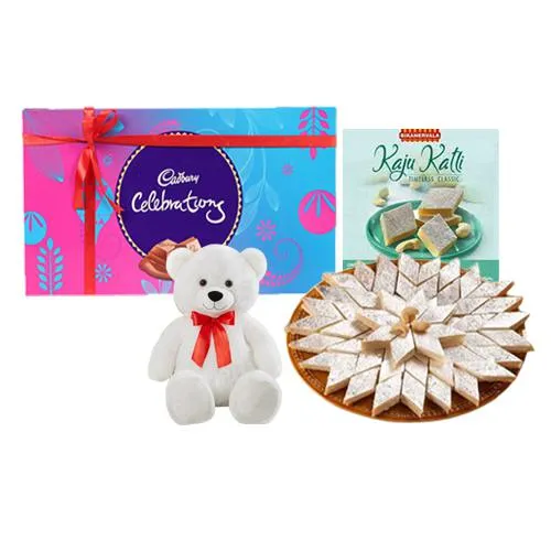 Merge your love with this Kaju Katli (500 gms) from Bikanervalas with 6 inches Teddy N Cadbury Celebration Chocolate Pack (126 gms) and send it to your dearest ones. (Only Available at Ahmedabad)