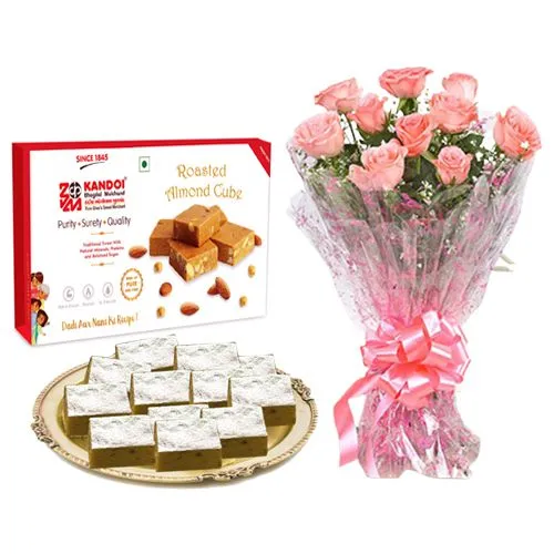 Roasted Almond Cube from Kandoi Bhogilal Mulchand with Pink Rose Bouquet