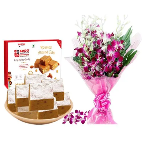 Shop N Send Roasted Almond Cube (500 Gms) from Kandoi Bhogilal Mulchand with 10pcs Orchid Bouquet for wishing them on their special day. (Only Available at Ahmedabad)
