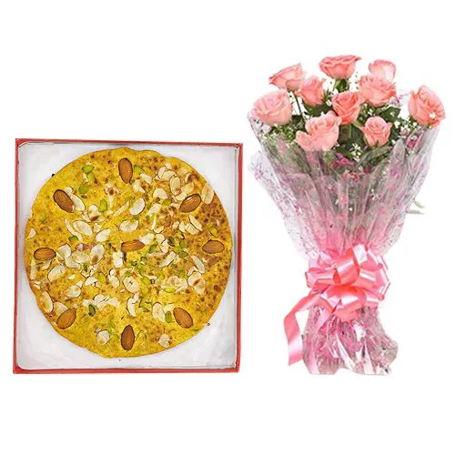 Badam Rotlo from Kandoi Bhogilal Mulchand with Pink Rose Bouquet
