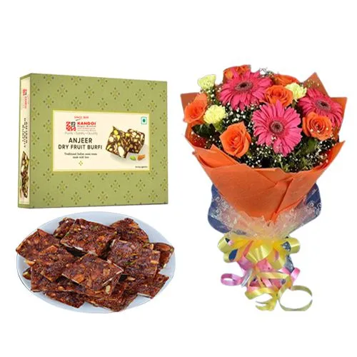 Khajur Anjeer Bite from Kandoi Bhogilal Mulchand with Mixed Flower Arrangement