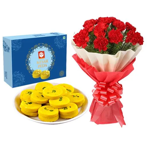 Shop Online for Kesar Mewa Peda - 250 gm from Mohanlals Mithaiwala with 12pcs Red Carnation Tissue Wrapped Bouquet N send it to your family N friends. (Only Available at Ahmedabad)
