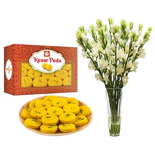 Buy Online to Send Kesar Mewa Peda - 250 gm from Mohanlals Mithaiwala with a Rajnigandha Stems in a Glass Vase for your known N loved people. (Only Available at Ahmedabad)